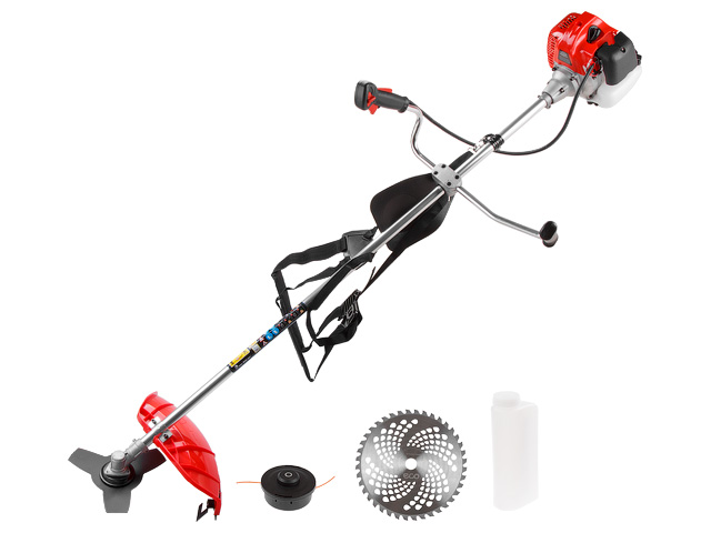 Мощность 1850 Вт; объем двигателя 52 см3; режущий инструмент: леска, нож; диаметр лески 2.4 мм; ширина кошения леской 43 см; ширина кошения ножом 25.5 см; вес 7.7 кг.